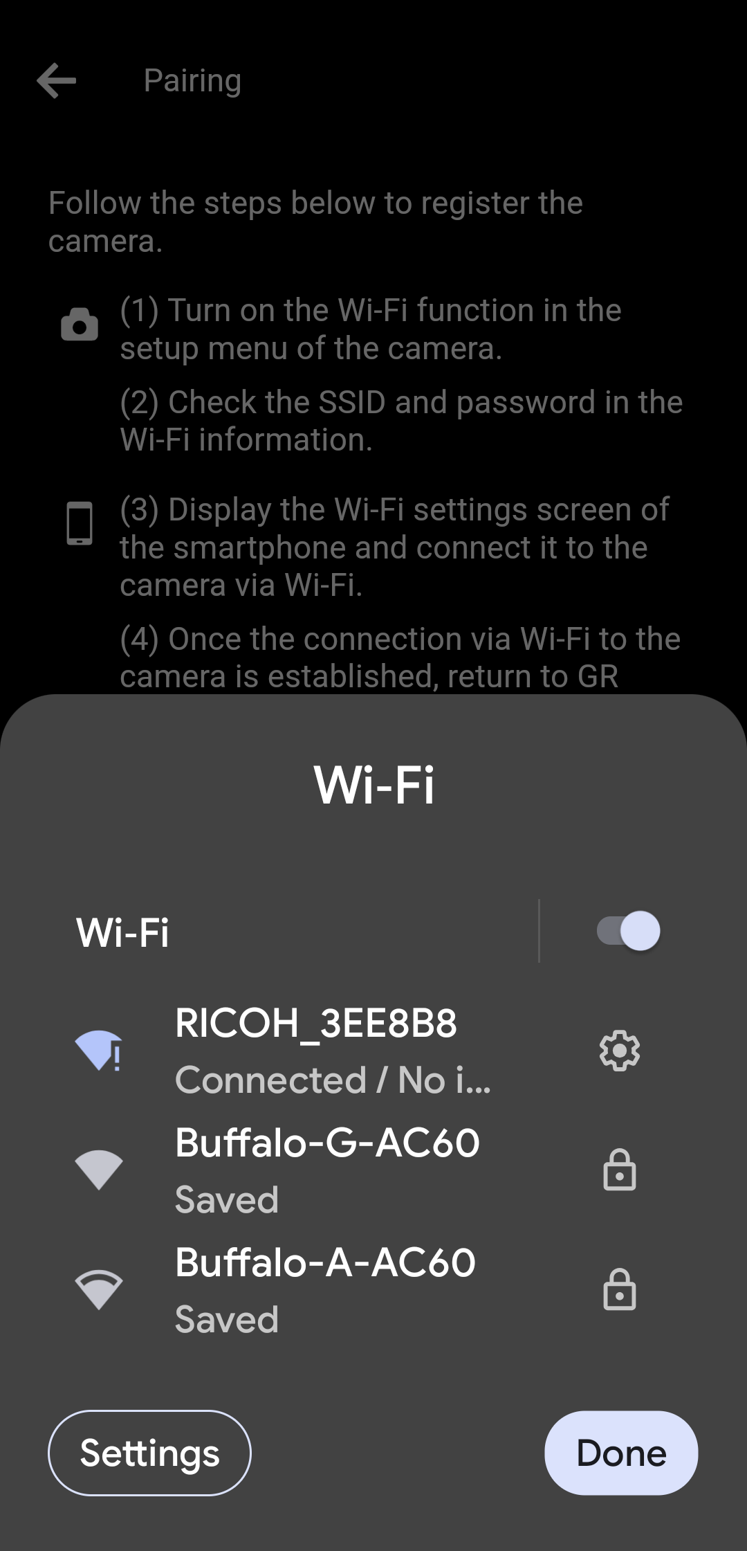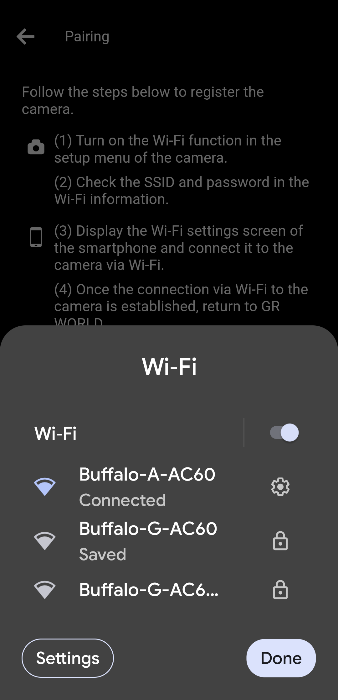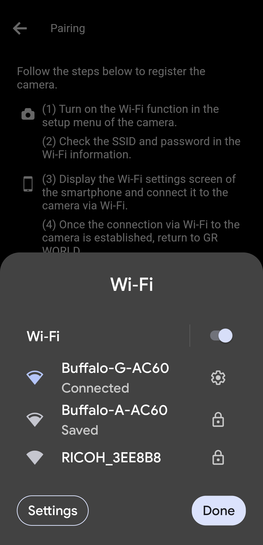 (3) When the Wi-Fi connection with the camera is complete, tap "Done".