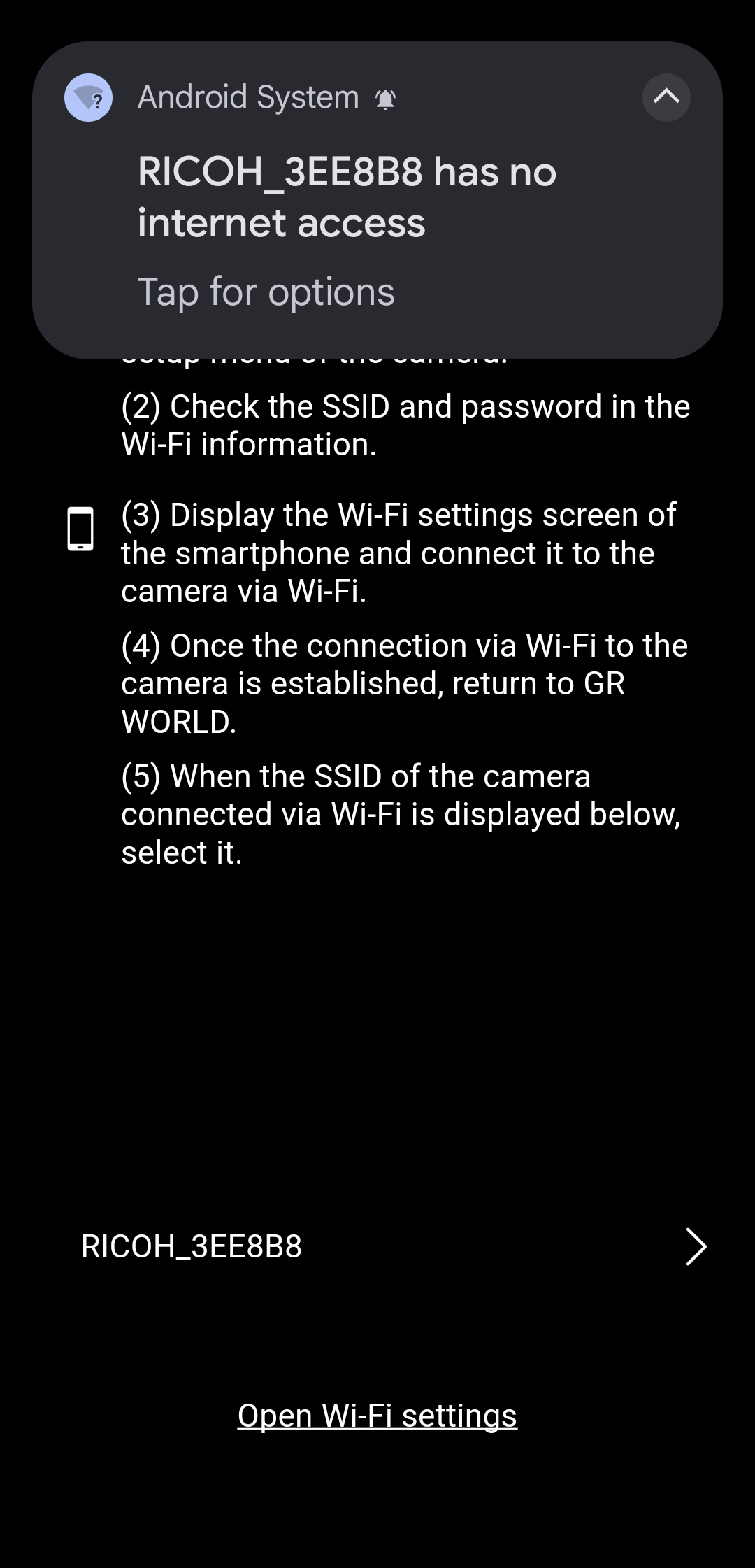 When the camera completes the operations (1) and (2), "Open Wi-Fi settings".