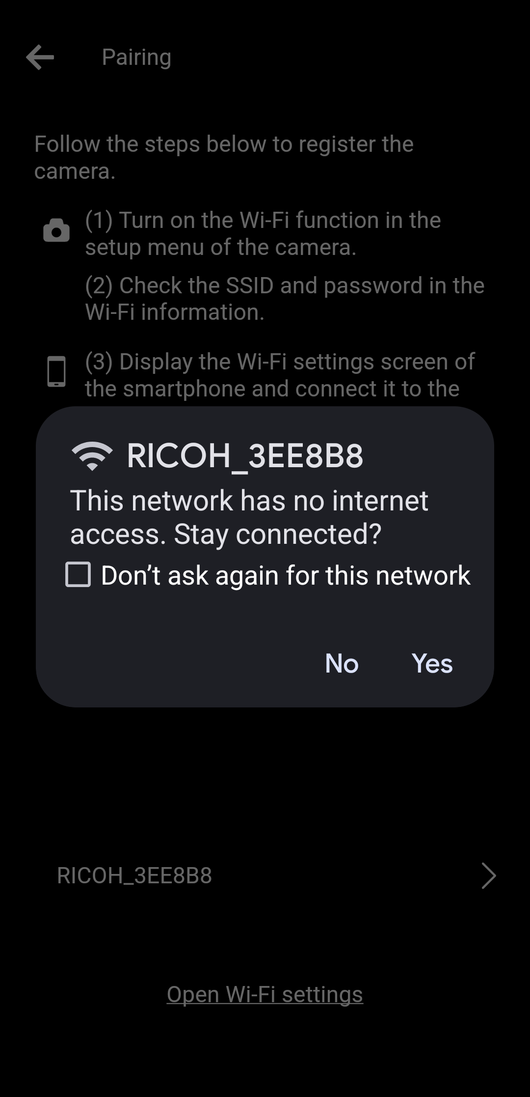 * “This network has no internet access. Stay connected?” This message may appear when the camera and smartphone are connected via Wi-Fi. Since the camera is not connected to the internet, checking to see if the smartphone continues to use the Wi-Fi connection with the camera. In order for the app to communicate with the camera, it must maintain a Wi-Fi connection with the camera. So, when prompted, select "Yes".