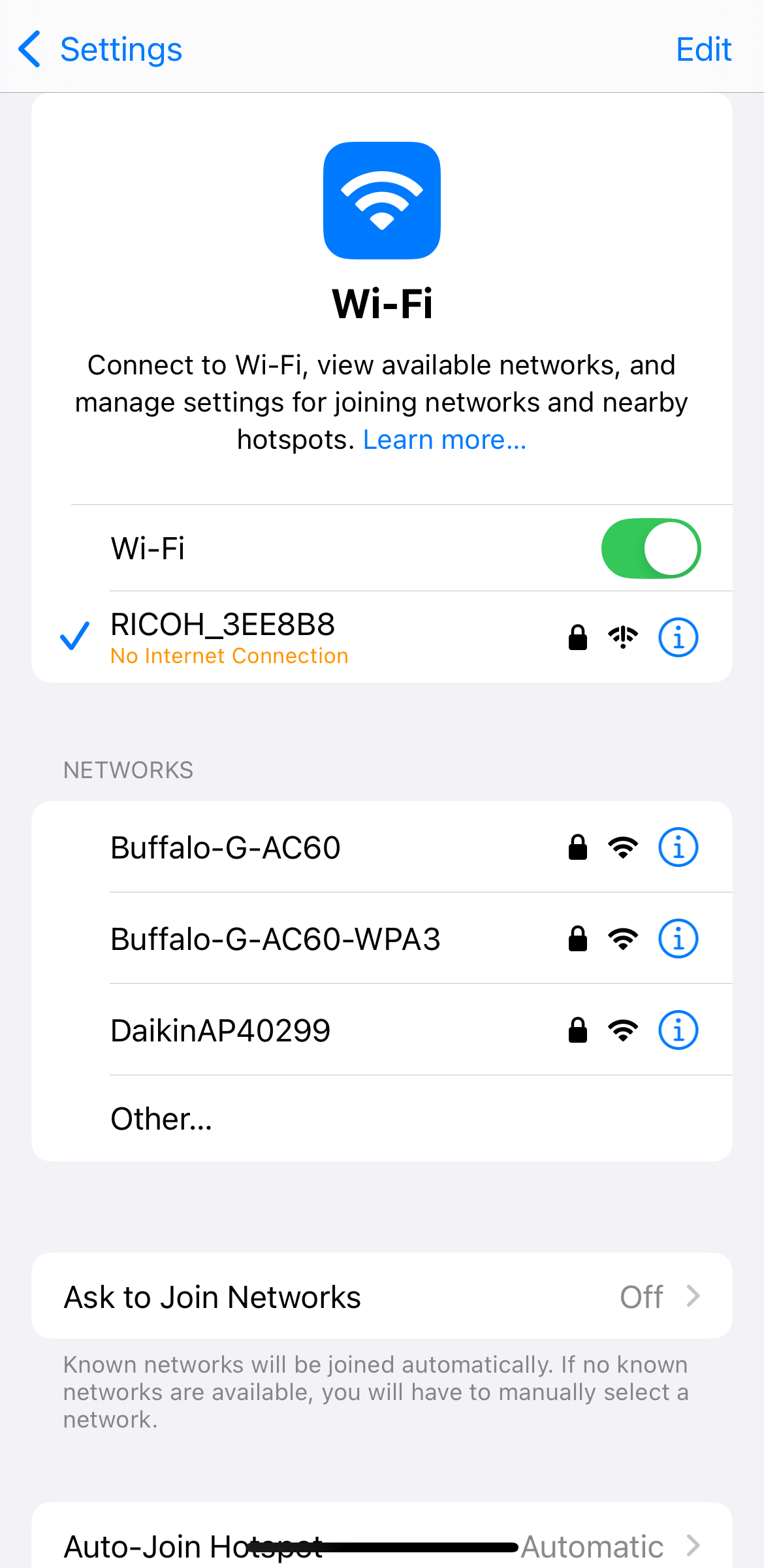 (1) If the SSID of your camera is not displayed on the Wi-Fi setting screen displayed in the app, tap "Settings" to open the Wi-Fi setting screen of the smartphone's Settings app.