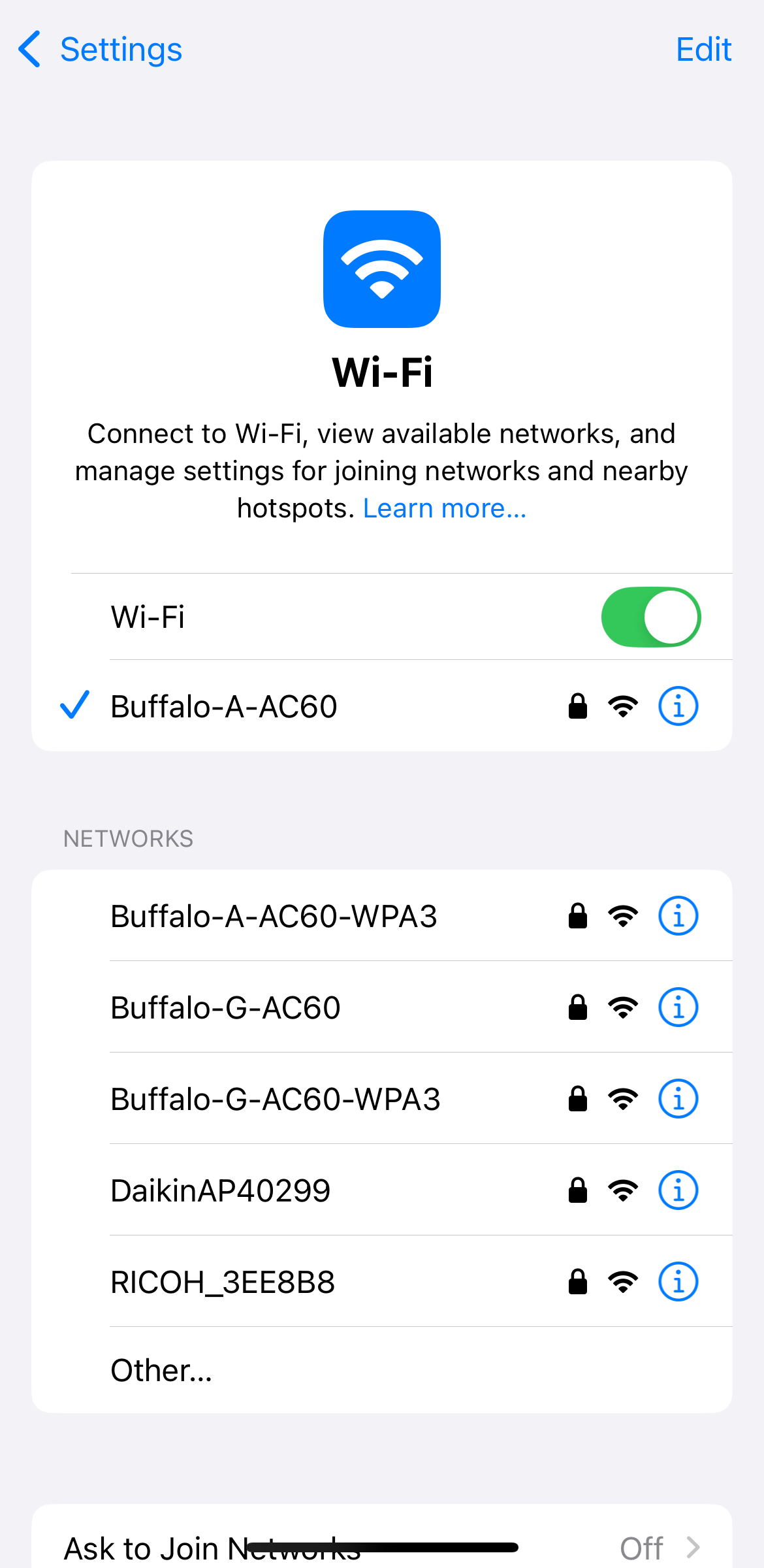 (1) Open the Wi-Fi setting screen of the smartphone's settings app.