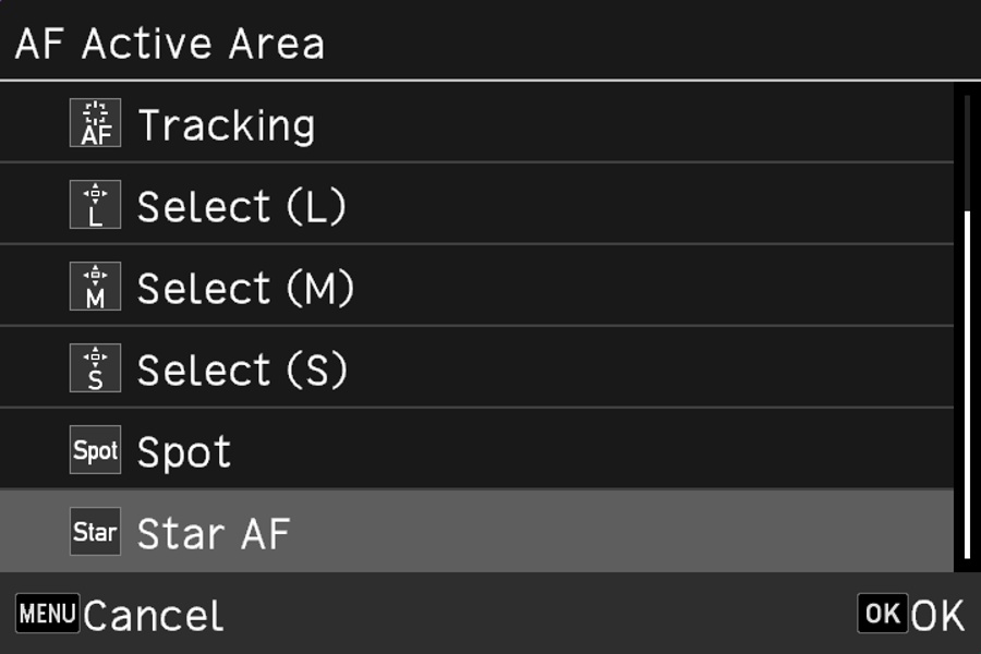 Star AF is a function for automatic focusing on stars in astrophotography. Normally, you would pinpoint on a star that is the easiest to bring into focus, then compose the image. With the Star AF, however, you can compose the image first, then focus on stars using the camera’s autofocus system. Since it requires slightly more time for autofocus operation, you are advised to securely mount your camera on a tripod. Use of the camera’s self-timer or the optional CS-205 Cable Switch is also recommended.