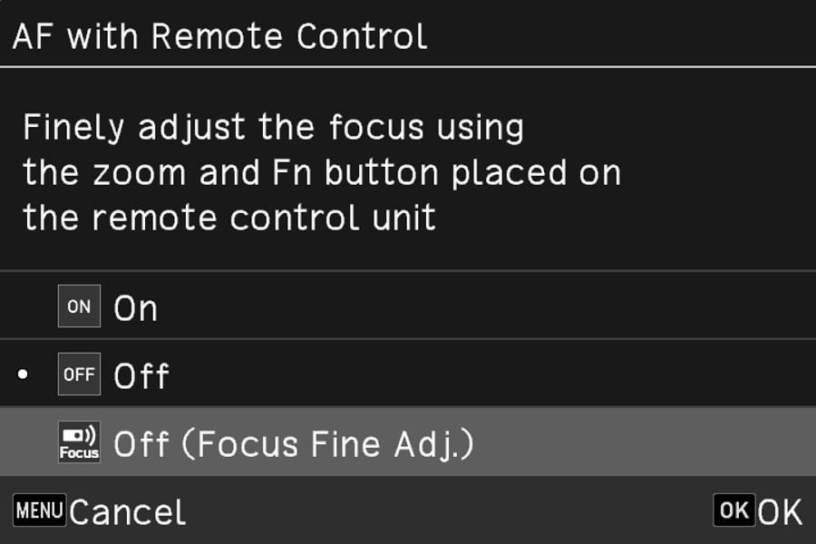 Remote Control Focus Fine Adjustment is a function that lets you fine-tune the focus using the optional O-RC1 Waterproof Remote Control unit without operating the lens or camera. This function is particularly useful in astrophotography, macro shooting and other applications where direct contact with the lens makes subtle focusing difficult. It is also useful in cold regions where delicate actions must be performed with gloved hands.