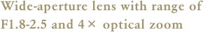 The 4× optical zoom lens has a focus range equivalent to 28-112mm in 35mm format, making it ideal for everyday use. With a range of F1.8-2.5, this bright, wide-aperture lens performs well in dim lighting and produces beautiful bokeh.