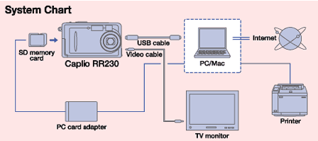 The Caplio RR230 comes standard with a handy USB port and cable, making the transfer of captured images to your PC very simple. The camera also boasts an internal 8MB and an external SD memory card expandable to 128MB - capable of storing hundreds of JPEG photographs.Enjoyable PC Editing Software