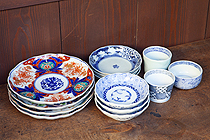 藍(あい)の色がすがすがしい古伊万里のみじん唐草文様の皿やなます皿、華やかな色絵の皿、蕎麦猪口(そばちょこ)、りん茶わんなど。近江水屋にはお気に入りの骨董(こっとう)の器もよく似合う。 |
