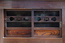 引き戸に目の粗い金網と細かい金網が二重に張られ、蠅帳になっている部分は、デザイン的にも面白い。風通しが良く、蠅などの虫が入らないから食品を入れておくのに適している。 |