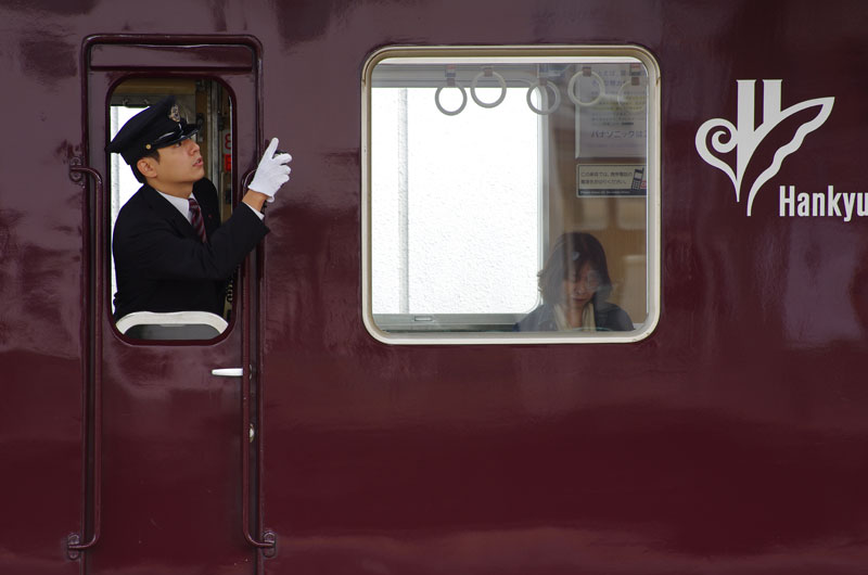 特急・梅田行きが先に出ると、準急が続いて梅田に向かう。信号とホームを確認する車掌さんの指差し。その白い手袋が印象に残る。