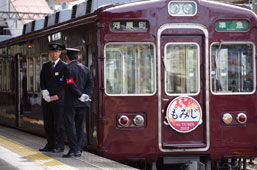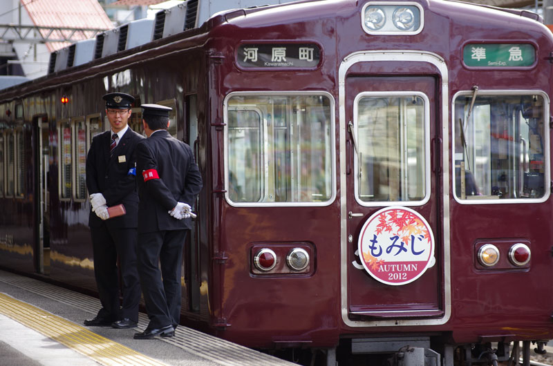 秋らしく「もみじ」のヘッドマークを掲げた京都河原町行き3300系準急。この日の準急は指導員が添乗する新人運転手さんが目立った。