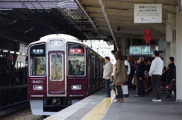 嵐山方面へは乗り換えの桂駅。河原町行き9300系特急にも多くの人が乗り込んだ。秋本番を迎える阪急沿線に観光客が繰り出す。