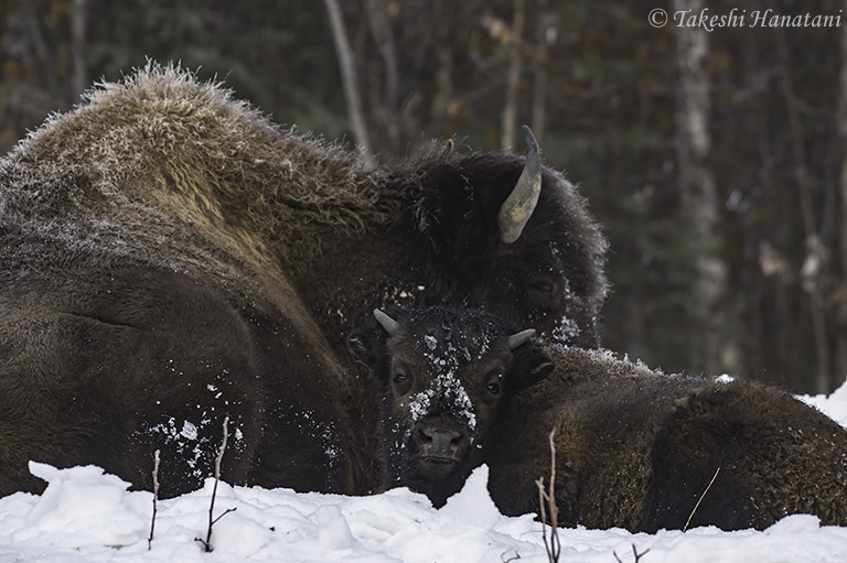 バイソンは、北米において人類により最も翻弄された野生動物といえるかもしれません。ヨーロッパ人が北米へ移入する以前、その生息数は約6千万頭であったと推測され、アラスカからカナダ西部、アメリカ本土からメキシコ北部にかけて分布していました。しかし乱獲により1890年頃には1,000頭未満に激減し、野生個体群としてはアメリカのイエローストーン国立公園とカナダ北西準州のウッド・バッファロー国立公園に残るのみです。現在では保護の動きが強く、各地で再導入されています。今では約50万頭が家畜として、そして約1万5千頭が野生で生息していると考えられています。ユーコンでは約800年前に絶滅したものの、1980年より再導入されました。