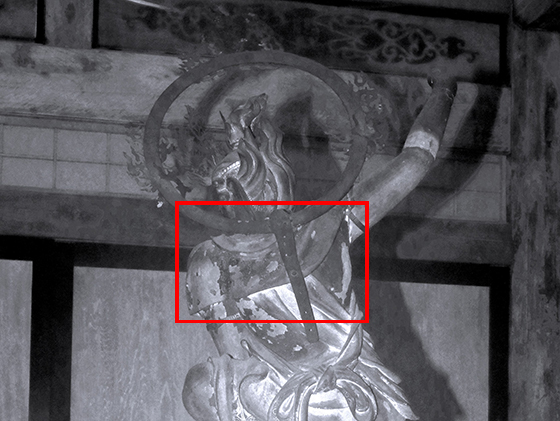 可視光線では確認できない文化財の表面を近赤外撮影を行う事で素材の違いによる反射や吸収による写り方の違いを比較できます。
