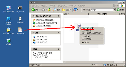 | [9] リムーバブルディスクのルートディレクトリに「fwdc131b.bin」をコピーます。 ルートディレクトリ以外のところに「fwdc131b.bin」をコピーしても、アップデートは実施されませんので注意してください。 |