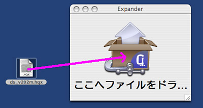 | [2] StuffIt Expander を起動し、ダウンロードしたファイルds_v202m.hqx を直接ドラッグして解凍します。直接ドラッグして解凍します。 MacOS10.4の場合はこちらからMac OS X 10.4用の「StuffIt Expander for Mac OS X 10.4」をダウンロードして、インストールした後にファームウェアファイルを解凍して下さい。 |
