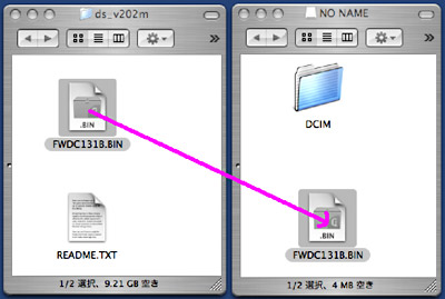 | [3] ダウンロードしたファイルを解凍すると、以下の2つのファイルができあがります。 ■fwdc131b.bin・・・ファームウェア本体 ■ readme.txt・・・ファームウェアのアップデート方法が書かれています。 |