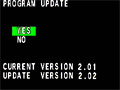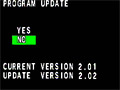 | [3] 液晶モニタに「NOW LOADING」と表示後、下図のような「PROGRAM UPDATE」表示になります。 十字キー(上、下)で「YES」を選び、「OK」ボタンを押します。 |