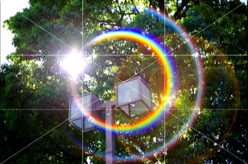 画面に対する光源の入射角度が10°~15°程度が最も出やすい角度となります。それ以外の角度でも発生はしますが、光線の集中や拡散の度合いによって、出方が異なります。入射角度が小さい場合は、作例(1)のように「虹色フレア」のリング径が小さめになります。入射角度が10°~15°の場合は作例(3)のように「虹色フレア」のリング径が大きめに出る事と併せ、2重または3重での発生がより見えやすくなります。