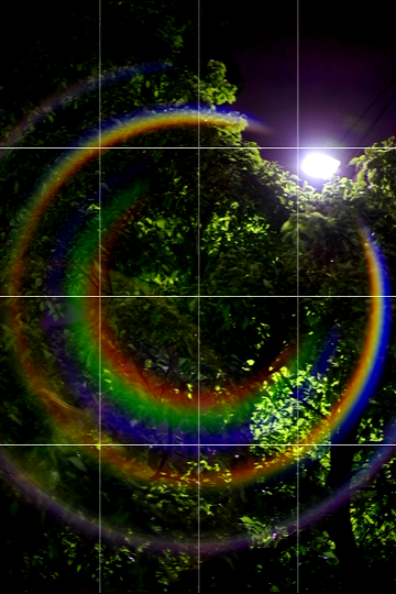 発生します。ただしある程度の光量がある明るい光源が画角内にある場合で、入射角度と光線の集中や拡散の度合いによって出方が異なります。夜景撮影時はファインダーでは見えにくい場合もありますので、その場合はライブビューにして、グリッド表示を16分割または9分割(黄金分割)表示させ、分割線の交点付近に明るい光源を位置させると、「虹色フレア」の現象がわかりやすくなります。